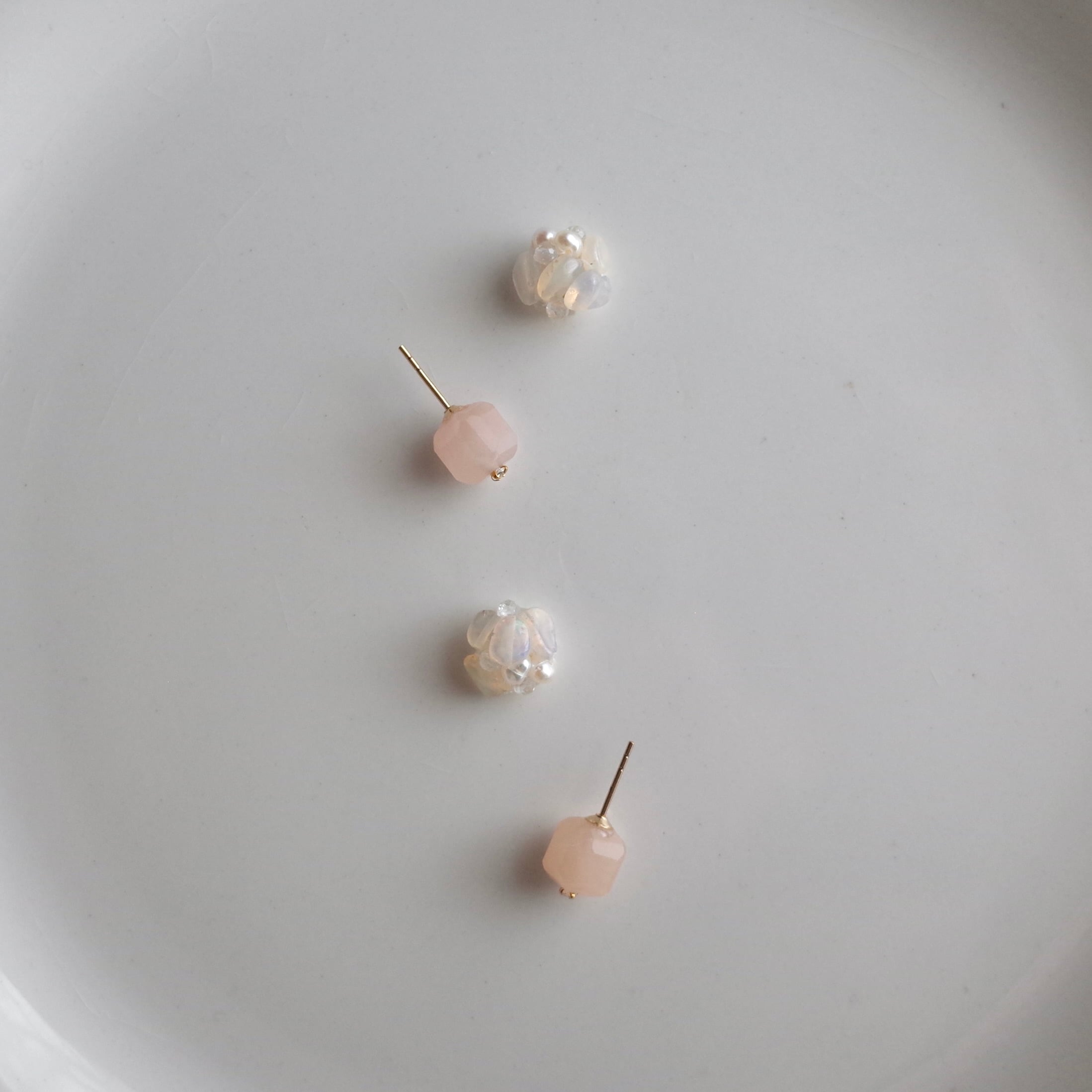 ピンクベージュのアベンチュリンにキュービックジルコニアを添えピアスに仕上げました。