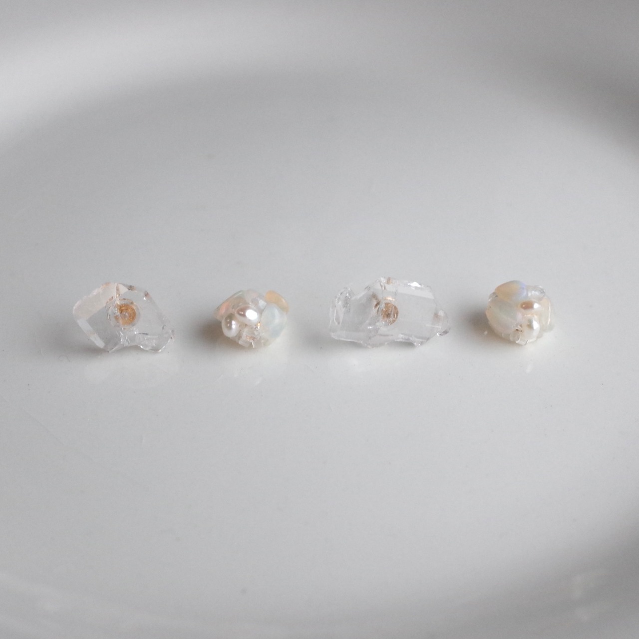 キャッチ部分は、エチオピア産オパール・パール・ホワイトトパーズ・クォーツ・線状に優しく光るガラスビーズを編みキャッチに仕上げています。