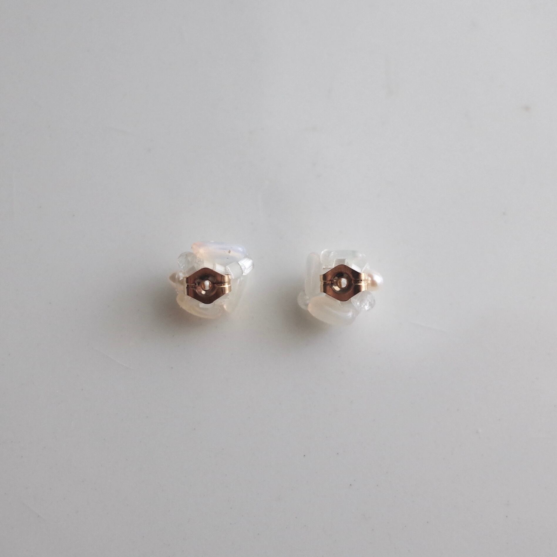 キャッチ部分は、エチオピア産オパール・パール・ハーキマーダイヤモンド・ホワイトトパーズ・線状に優しく光るガラスビーズを編みキャッチに仕上げています。