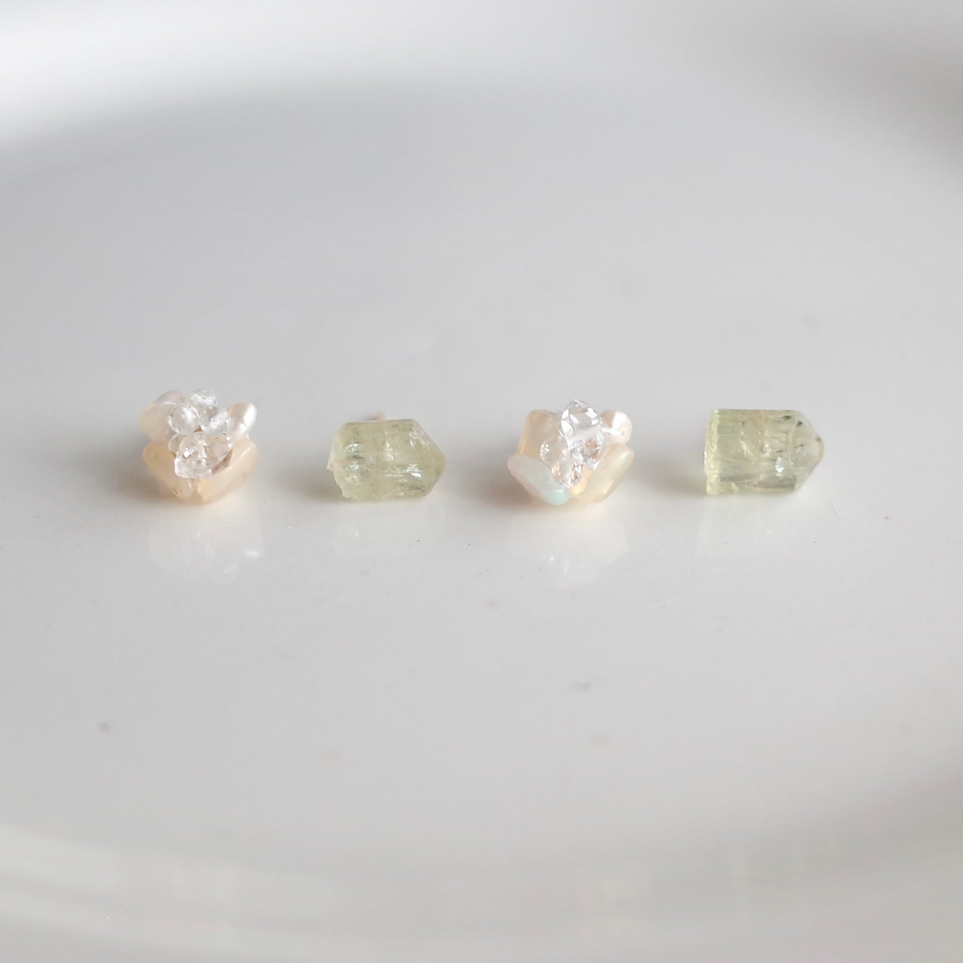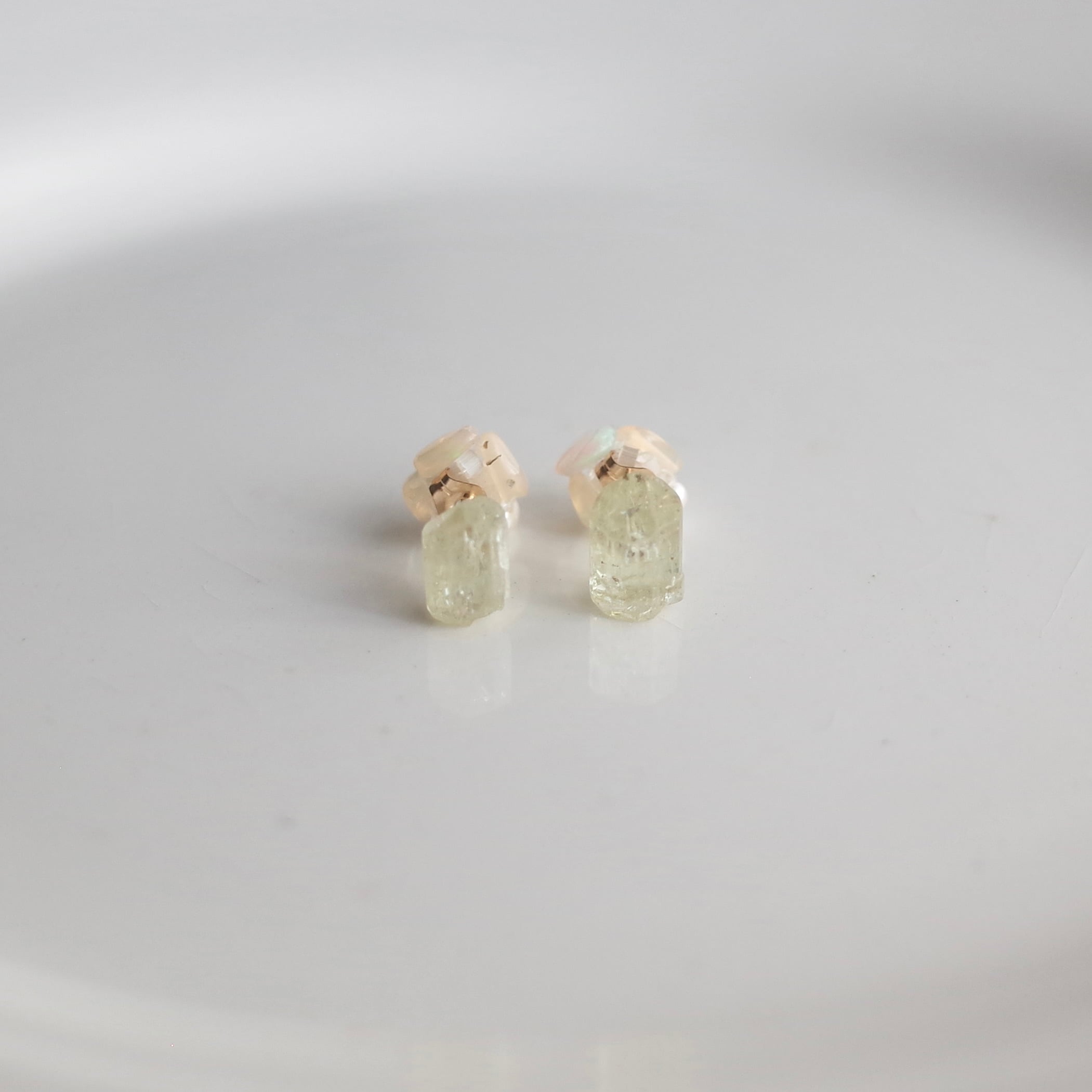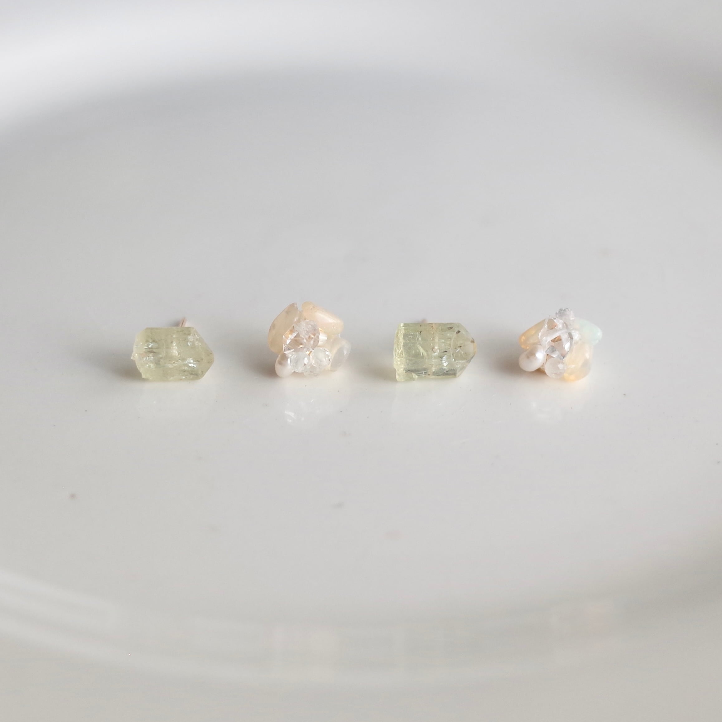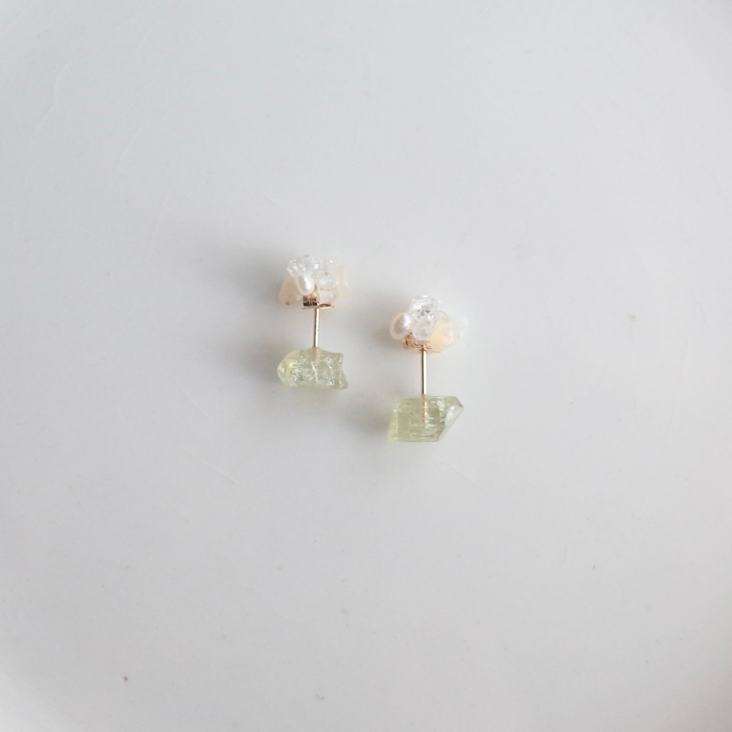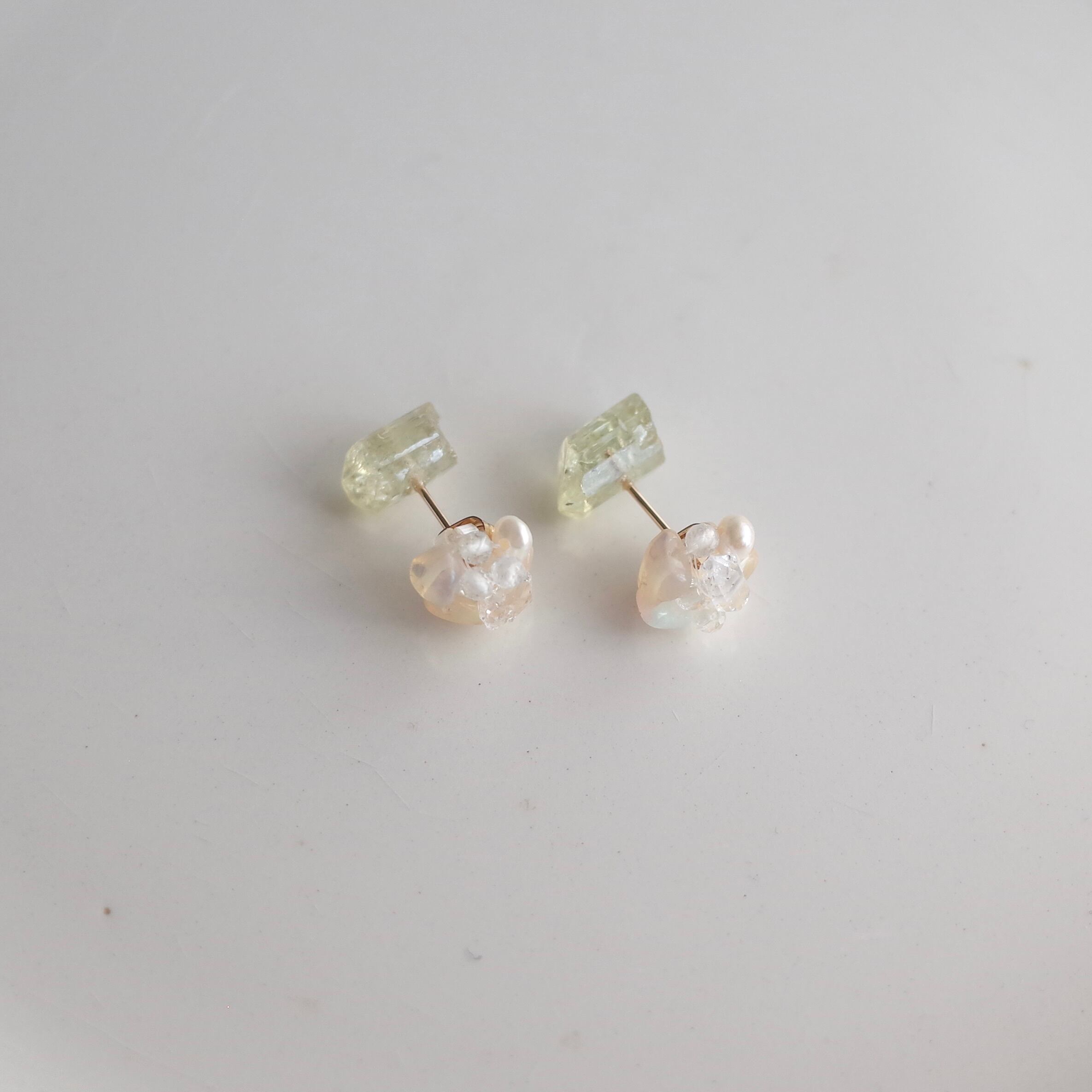 ふぞろい天然石ピアス / イエローアパタイト / オパールとハーキマーダイヤモンドキャッチ / 14kgf