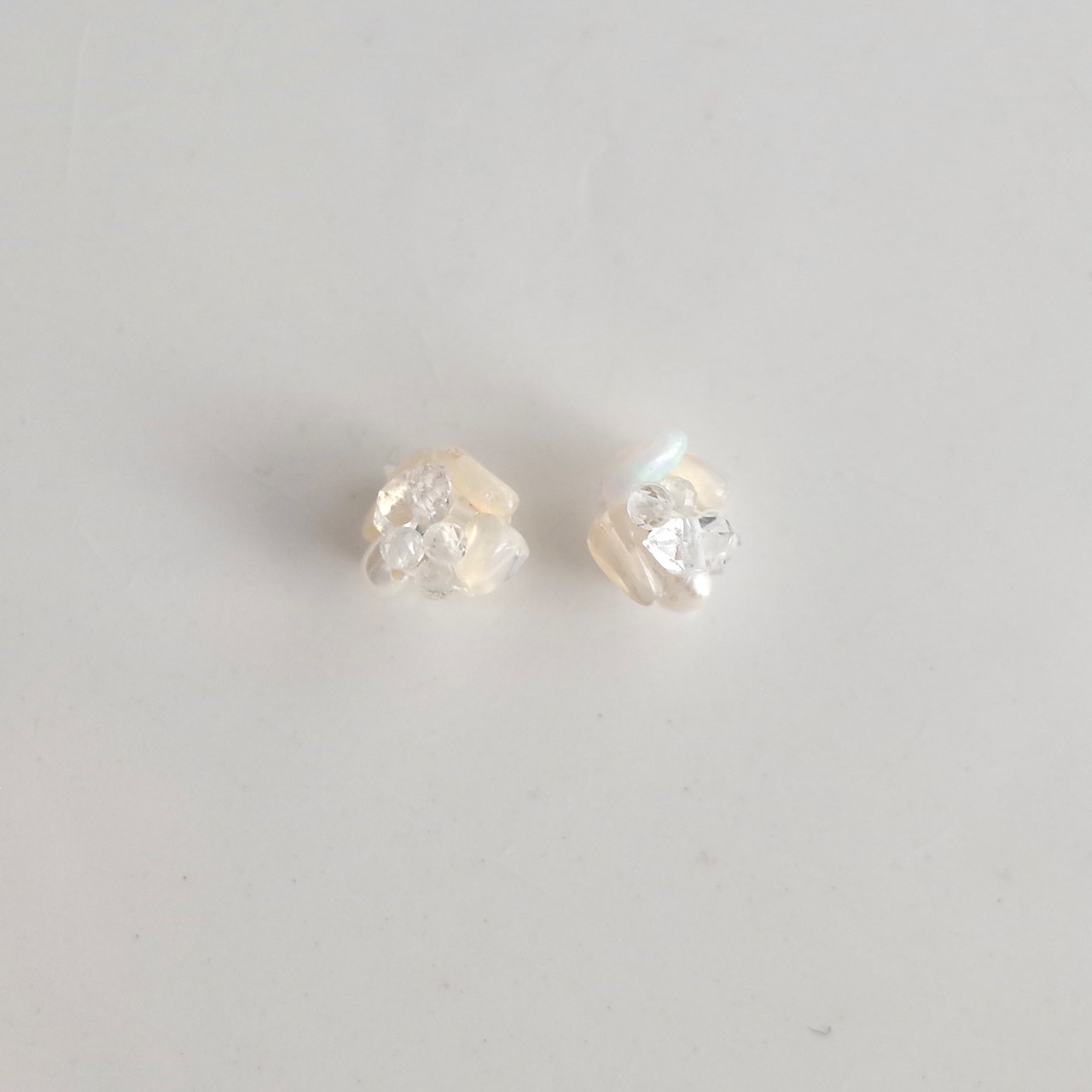 キャッチ部分は、エチオピア産オパール・淡水パール・ハーキマーダイヤモンド・ホワイトトパーズ・線状に優しく光るガラスビーズを編みキャッチに仕上げております。