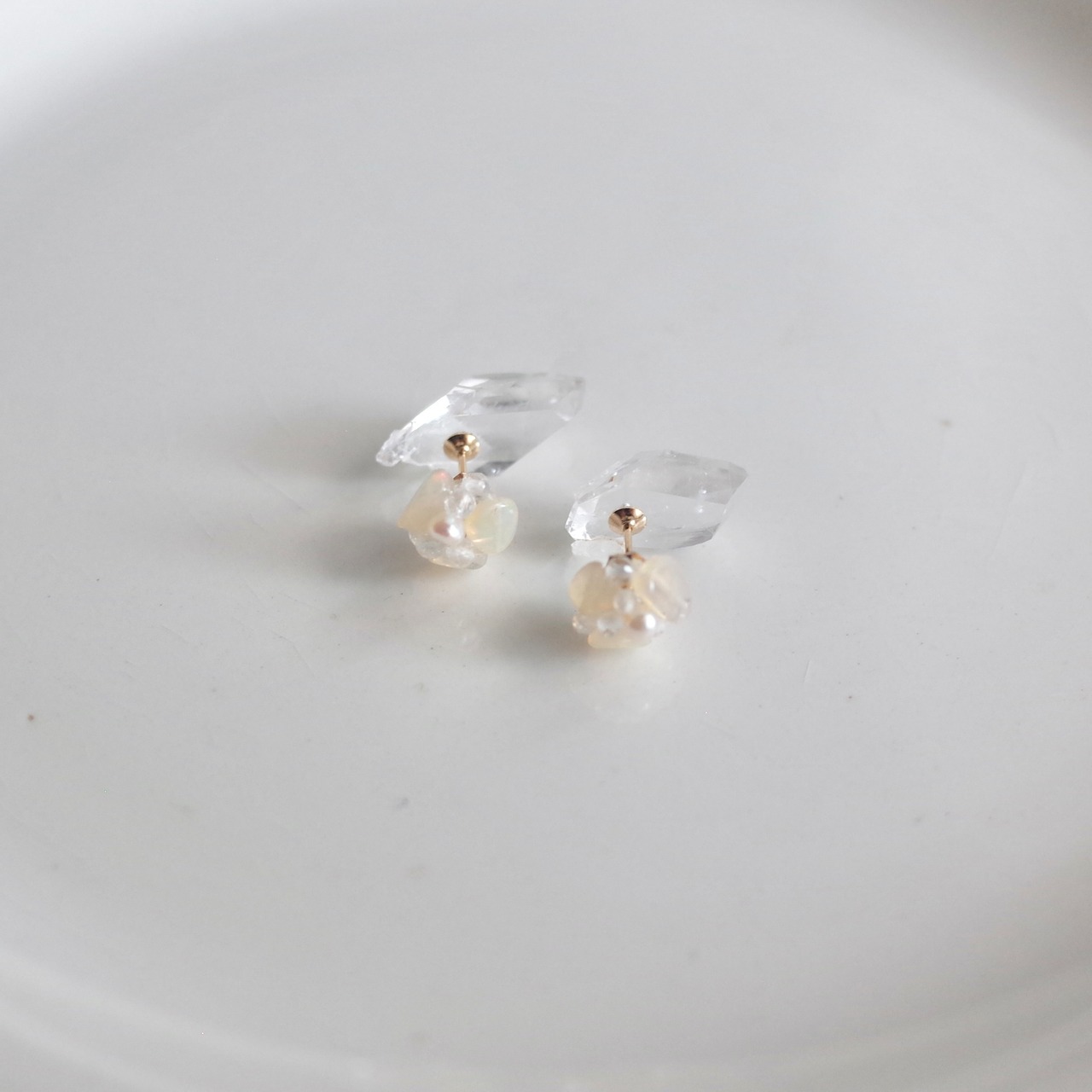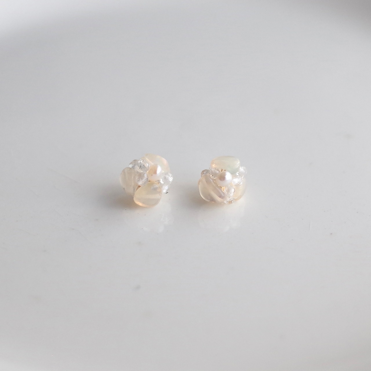 キャッチ部分は、エチオピア産オパール・パール・ホワイトトパーズ・クォーツ・線状に優しく光るガラスビーズを編みキャッチに仕上げています。