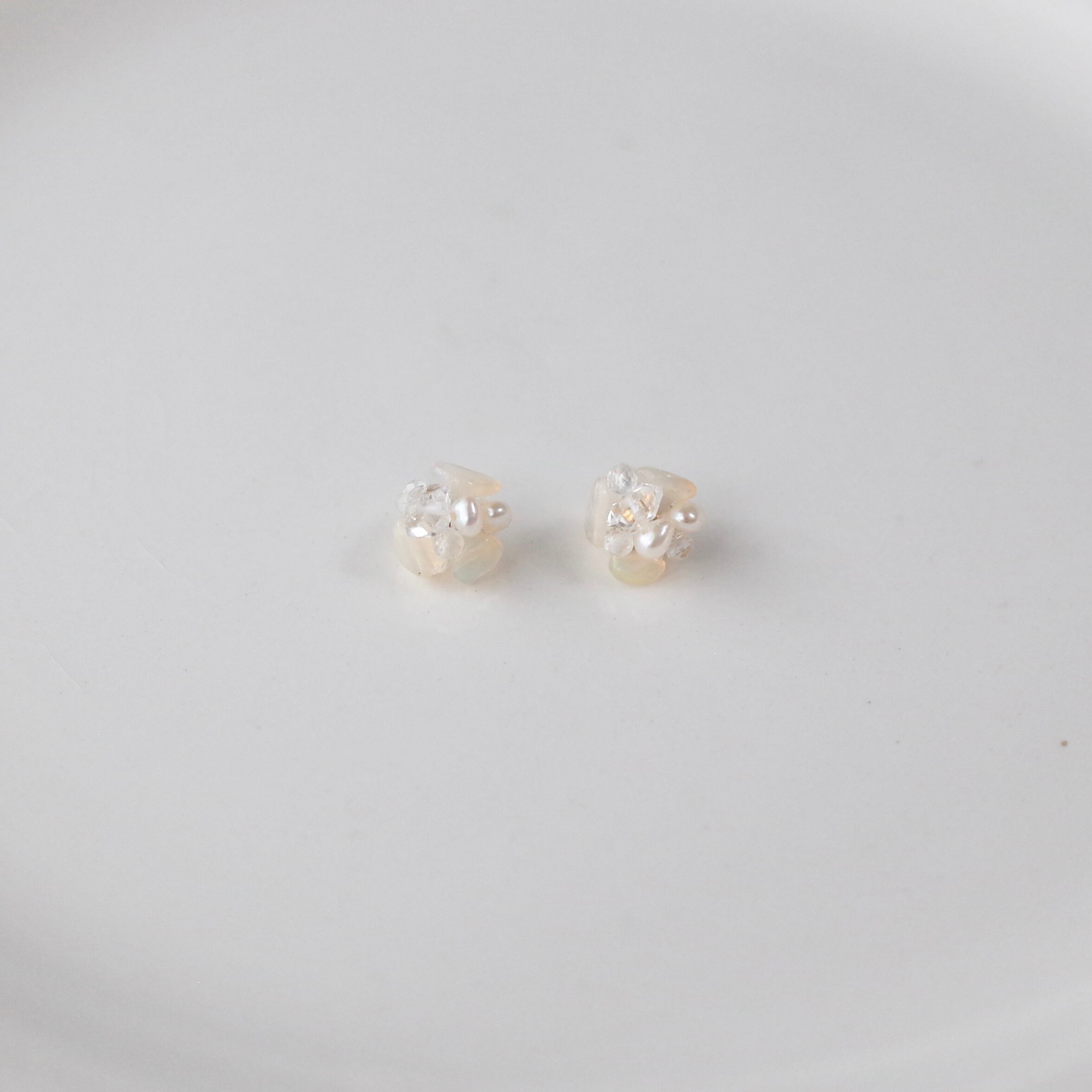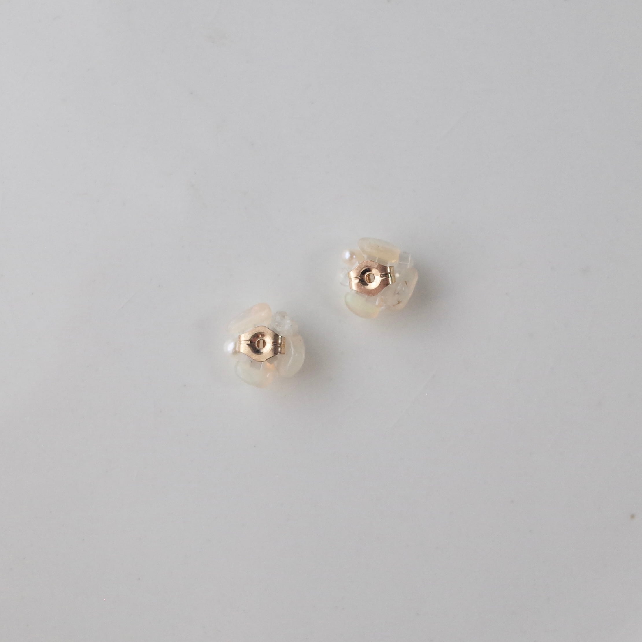 キャッチ部分は、エチオピア産オパール・パール・ハーキマーダイヤモンド・ホワイトトパーズ・線状に優しく光るガラスビーズを編みキャッチに仕上げています。