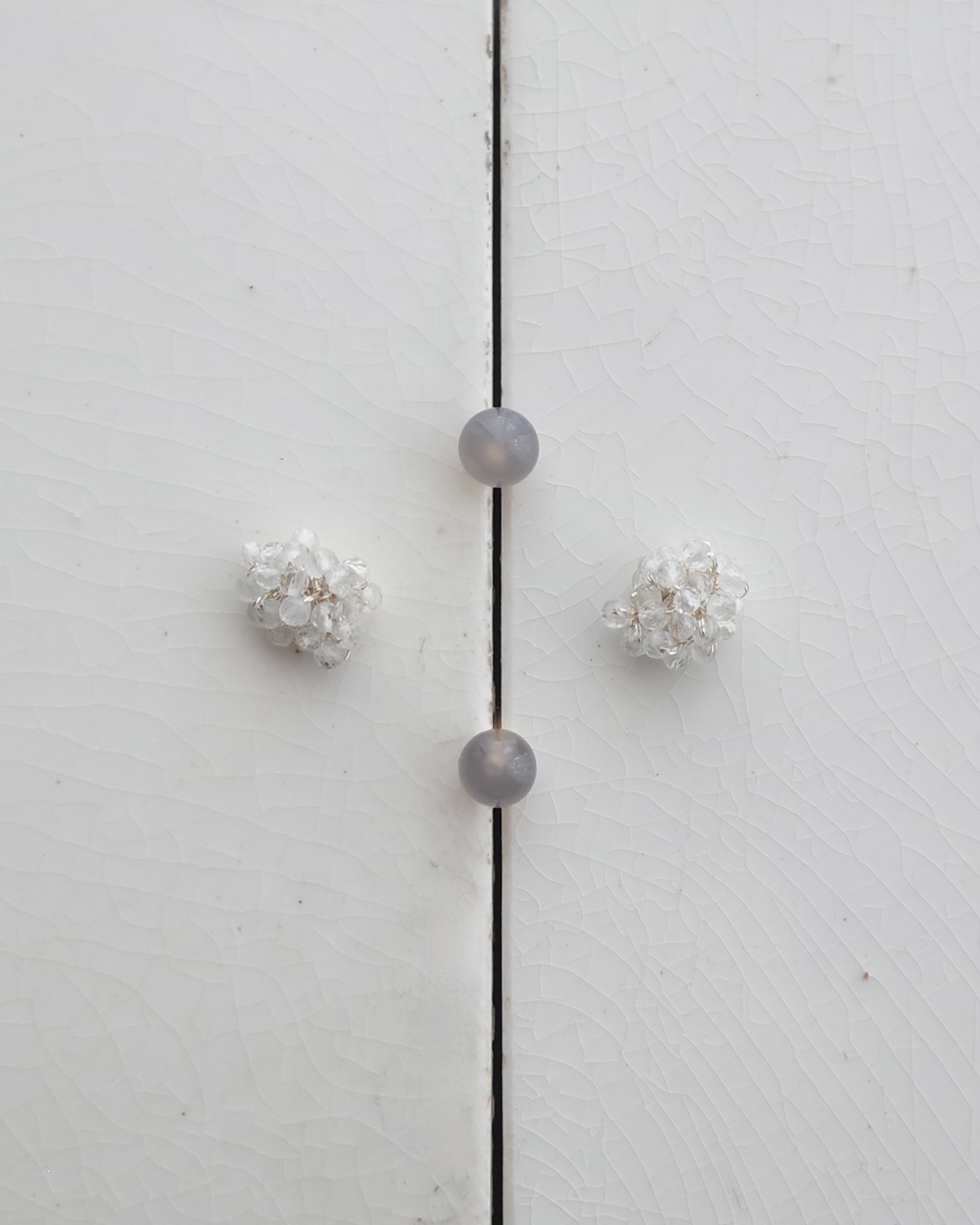キャッチ部分は、ブラジル産ホワイトトパーズを編みキャッチに仕上げました。
