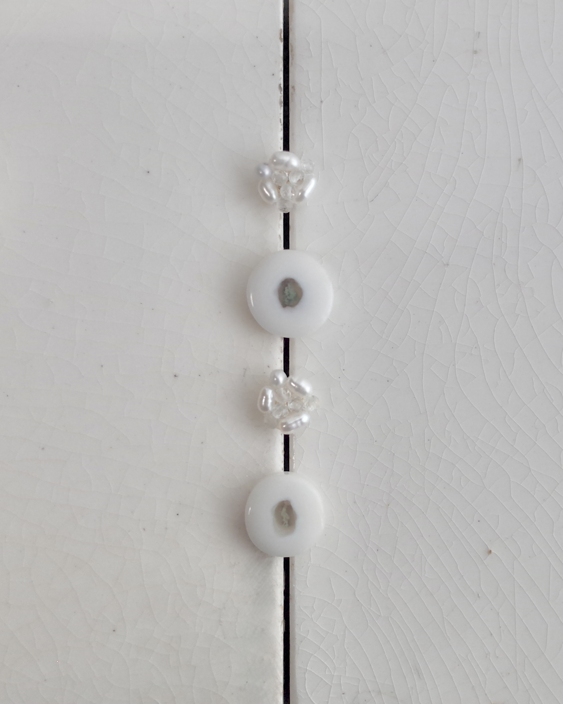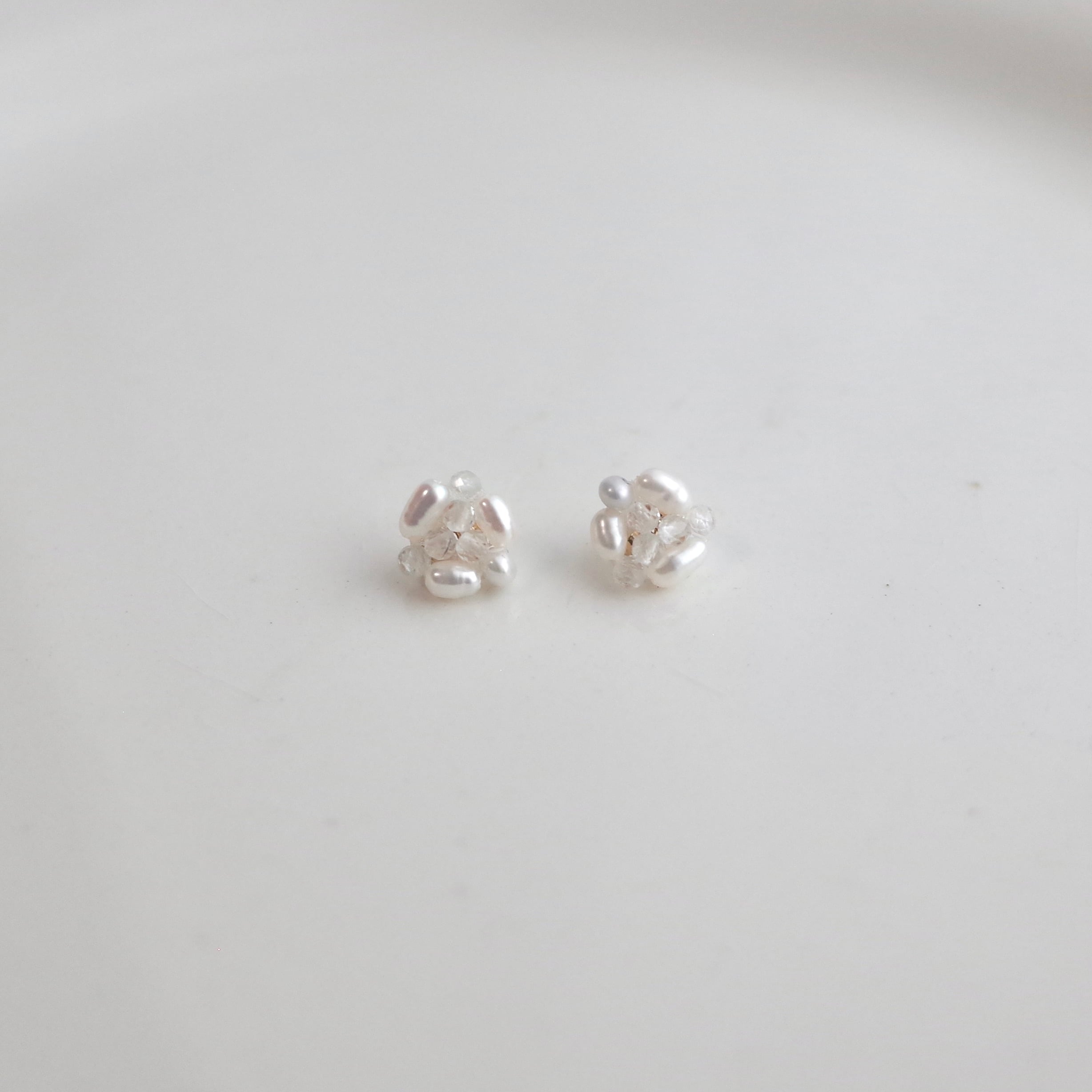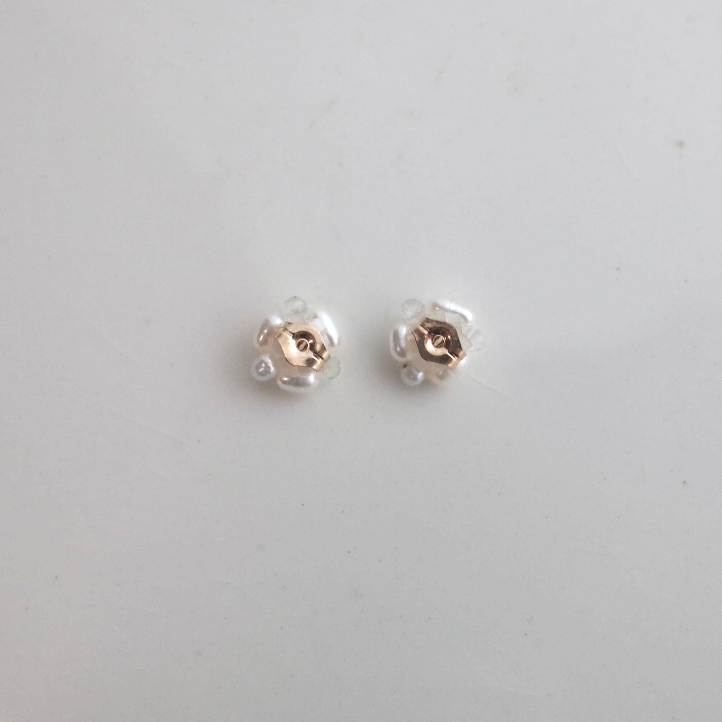 キャッチ部分は、ラウンドパール・ライスパール・ホワイトトパーズ・線状に優しく光るガラスビーズを編み仕上げております。
