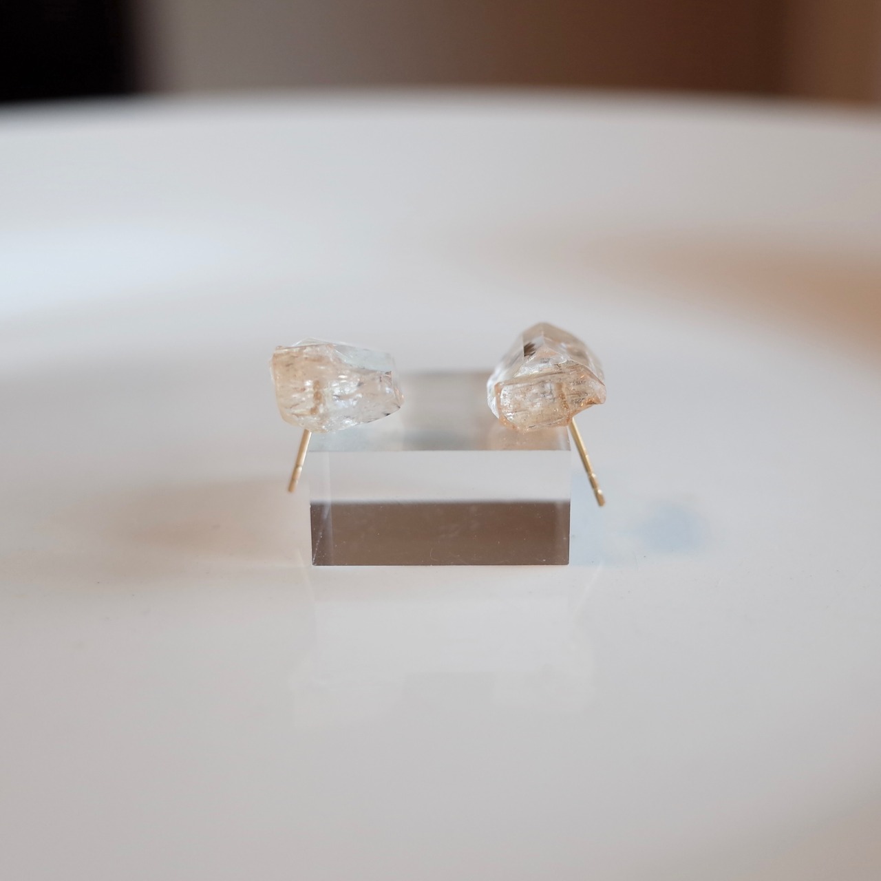 左右の表情が異なるクリアなトパーズの結晶に、インペリアルトパーズを合わせピアスに仕上げました。