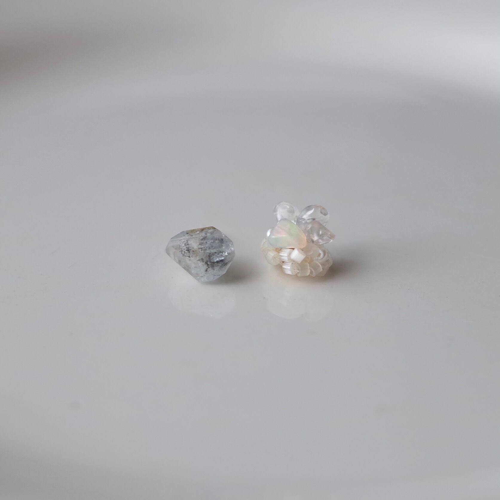 キャッチ部分は、エチオピア産オパール・淡水パール・クォーツ(水晶)・線状に優しく光るガラスビーズを編みキャッチに仕上げた手仕事によるピアスです