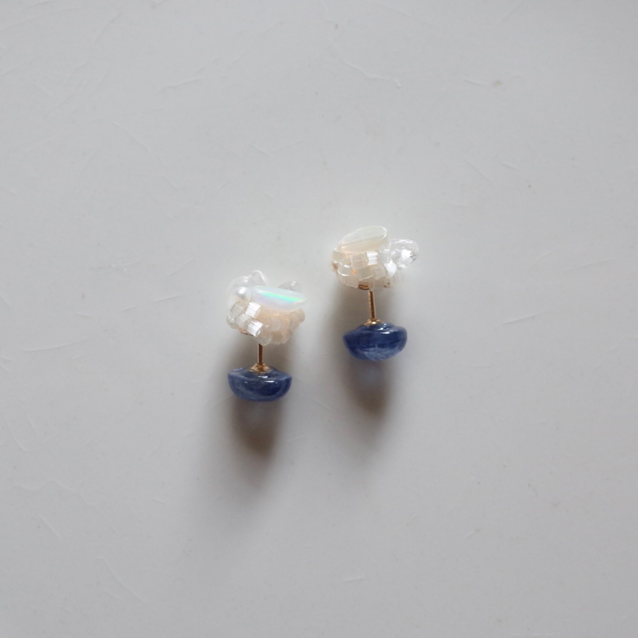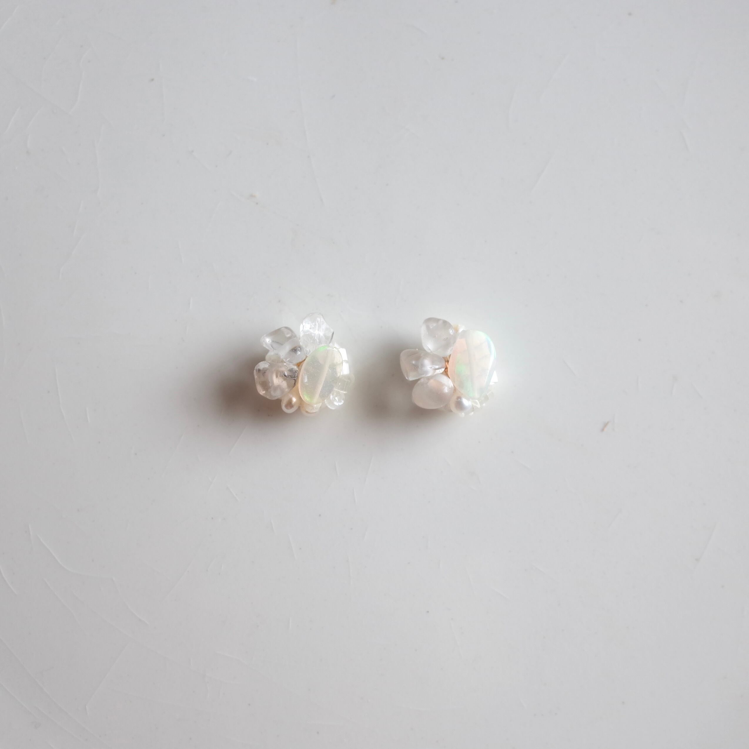 キャッチ部分は、エチオピア産オパール・淡水パール・クォーツ(水晶)・線状に優しく光るガラスビーズを編みキャッチに仕上げた手仕事によるピアスです