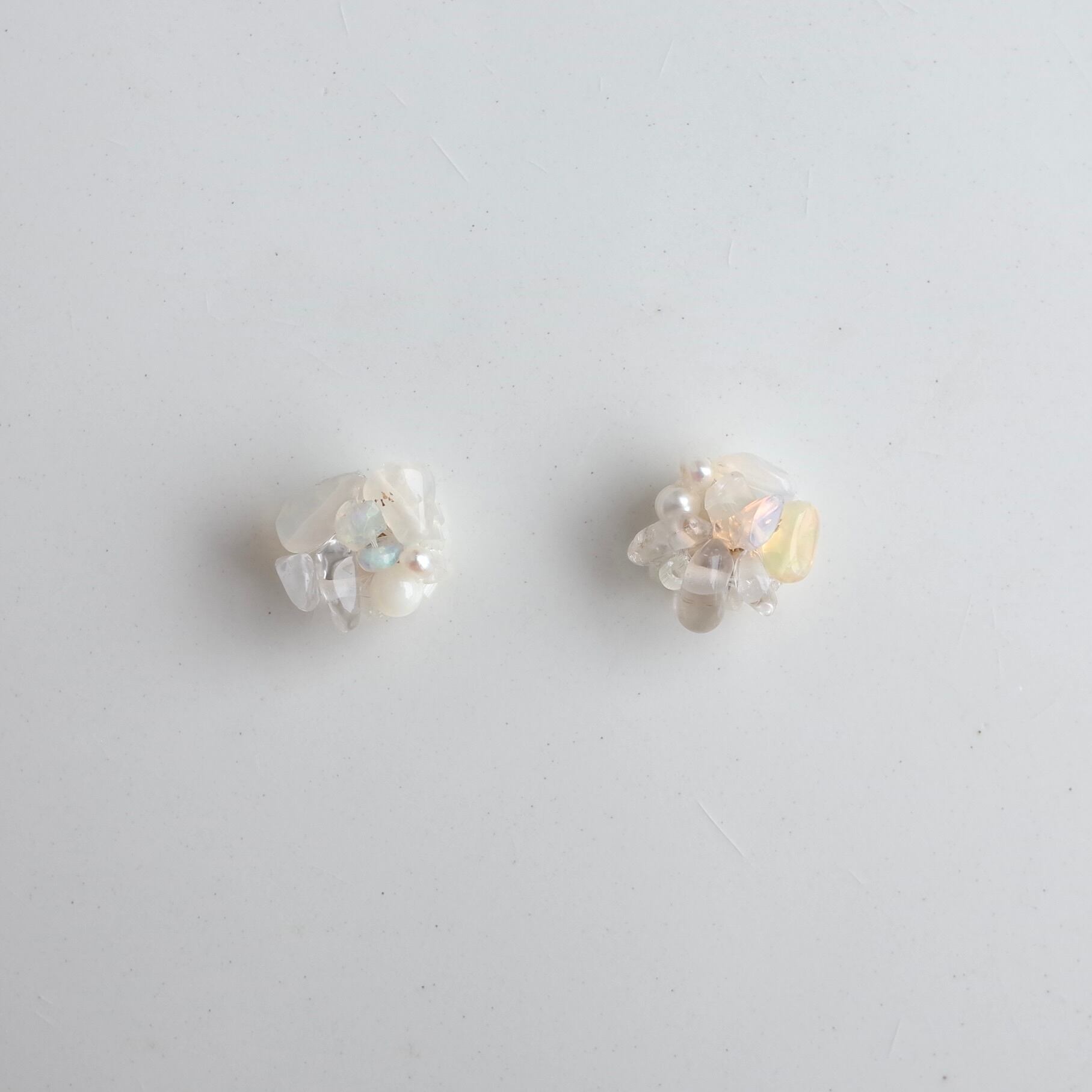 キャッチ部分は、エチオピア産オパール・淡水パール・クォーツ(水晶)・マザーオブパール・線状に優しく光るガラスビーズを編みキャッチに仕上げた手仕事によるピアスです