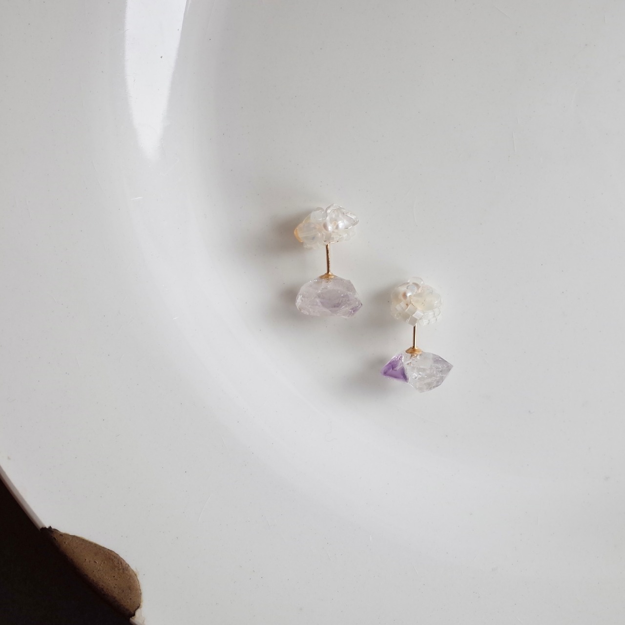 左右の表情が異なるクリアなダイヤモンドクォーツの結晶に、アメジストのかけらを添えてピアスに仕上げました。