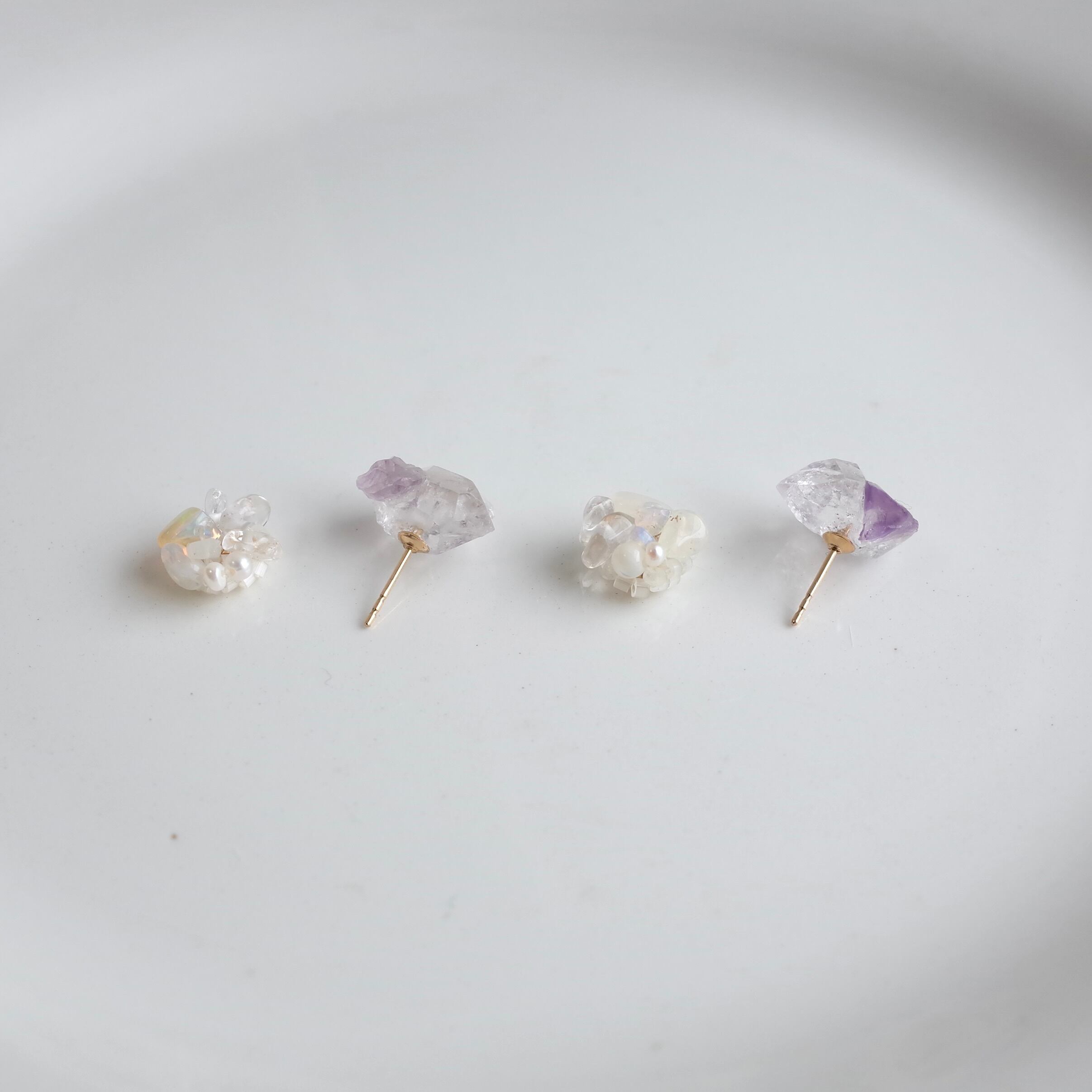 ふぞろい天然石ピアス / ダイヤモンドクォーツ・アメジスト / オパールキャッチ / 14kgf