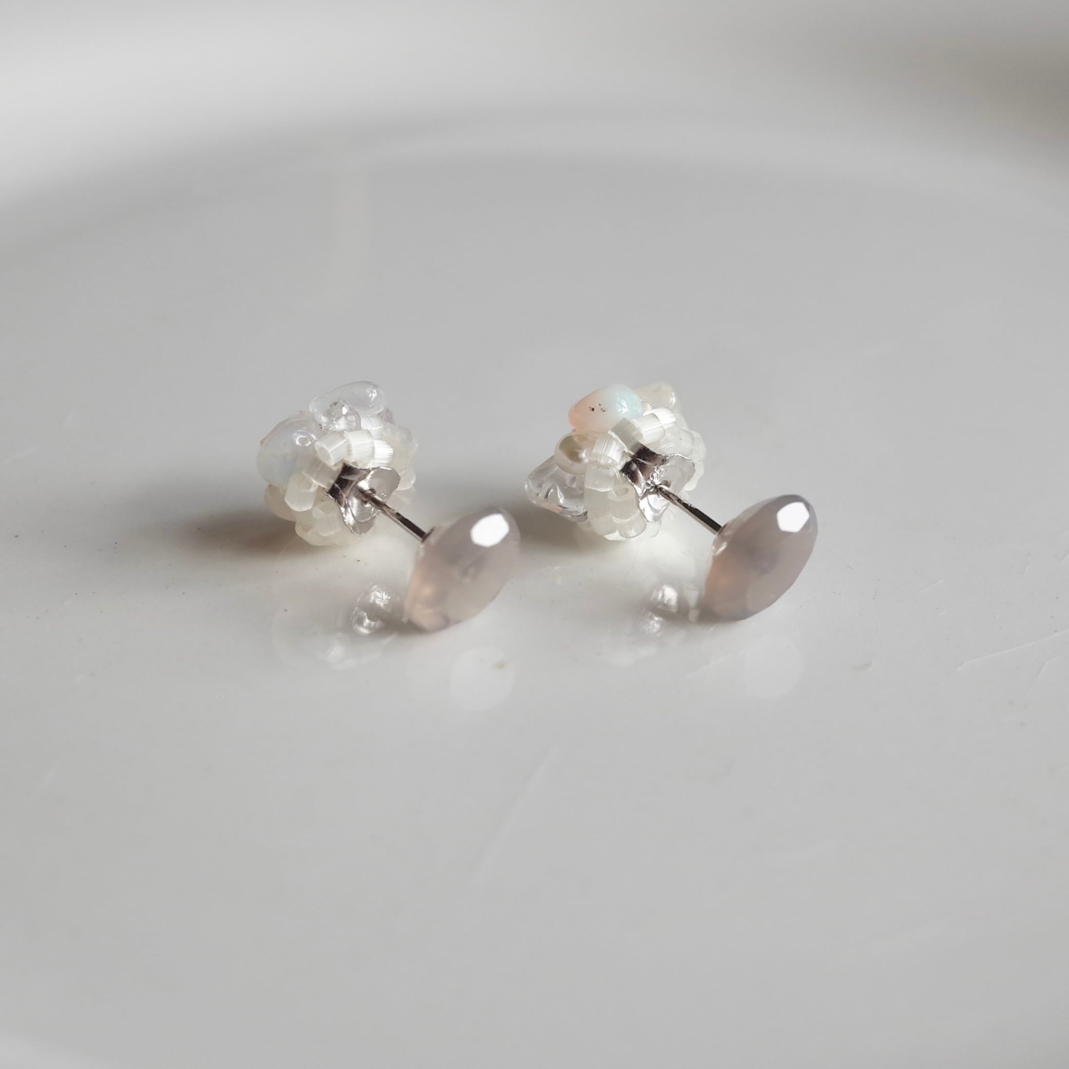 キャッチ部分は、エチオピア産オパール・淡水パール・ダイヤモンドクォーツ・クォーツ(水晶)・線状に優しく光るガラスビーズを編みキャッチに仕上げた手仕事によるピアスです