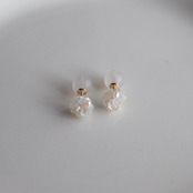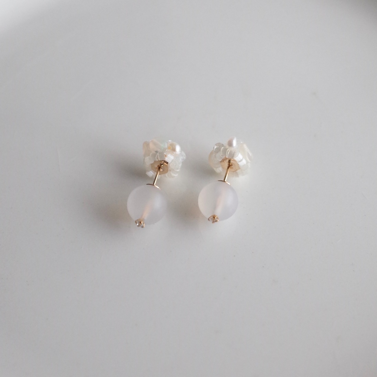 キャッチ部分は、エチオピア産オパール・淡水パール・ホワイトトパーズ・NY産ハーキマーダイヤモンド・線状に優しく光るガラスビーズを編みキャッチに仕上げた手仕事によるピアスです。