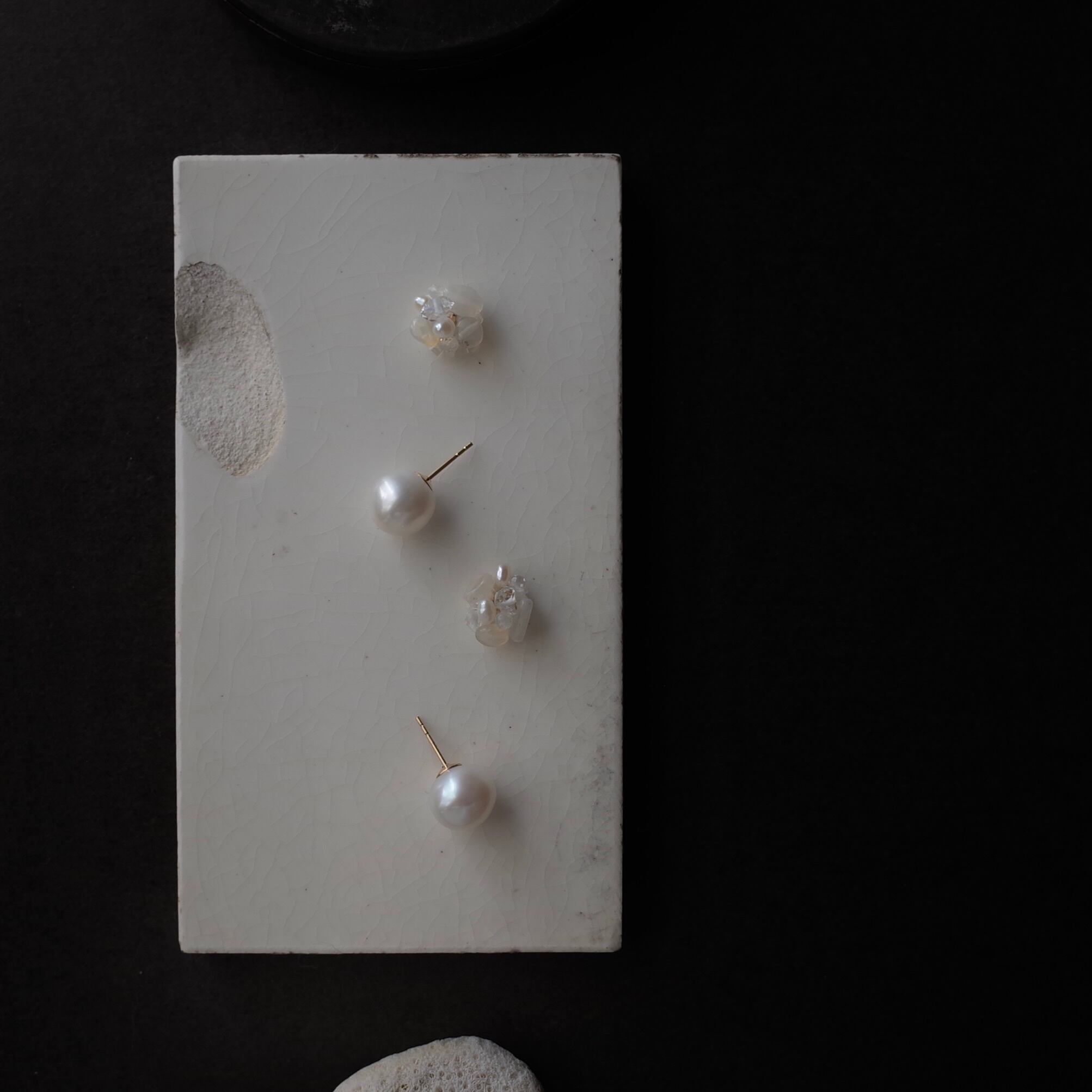 キャッチ部分は、エチオピア産オパール・パール・ハーキマーダイヤモンド・ホワイトトパーズ・クォーツ・線状に優しく光るガラスビーズを編みキャッチに仕上げた手仕事によるピアスです。