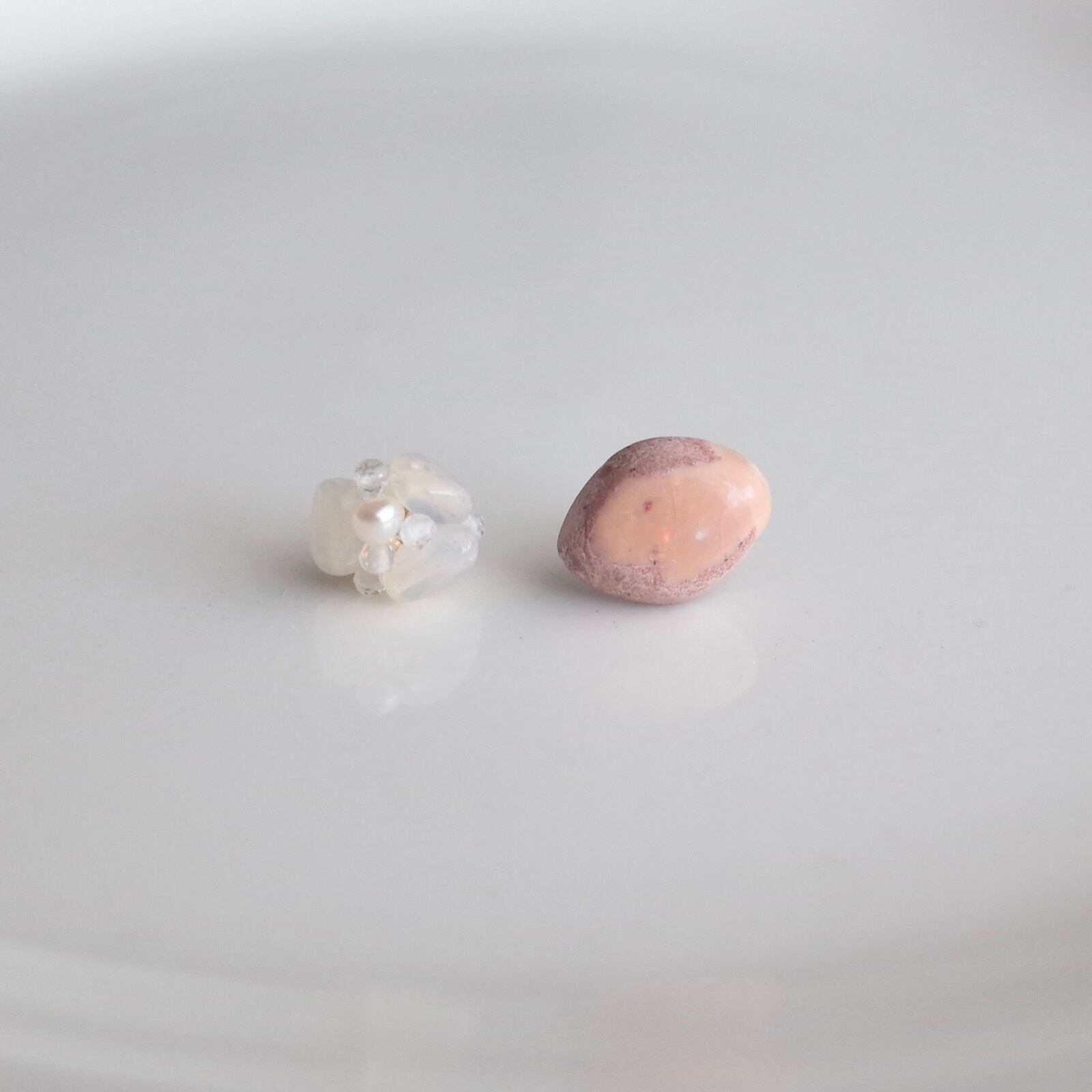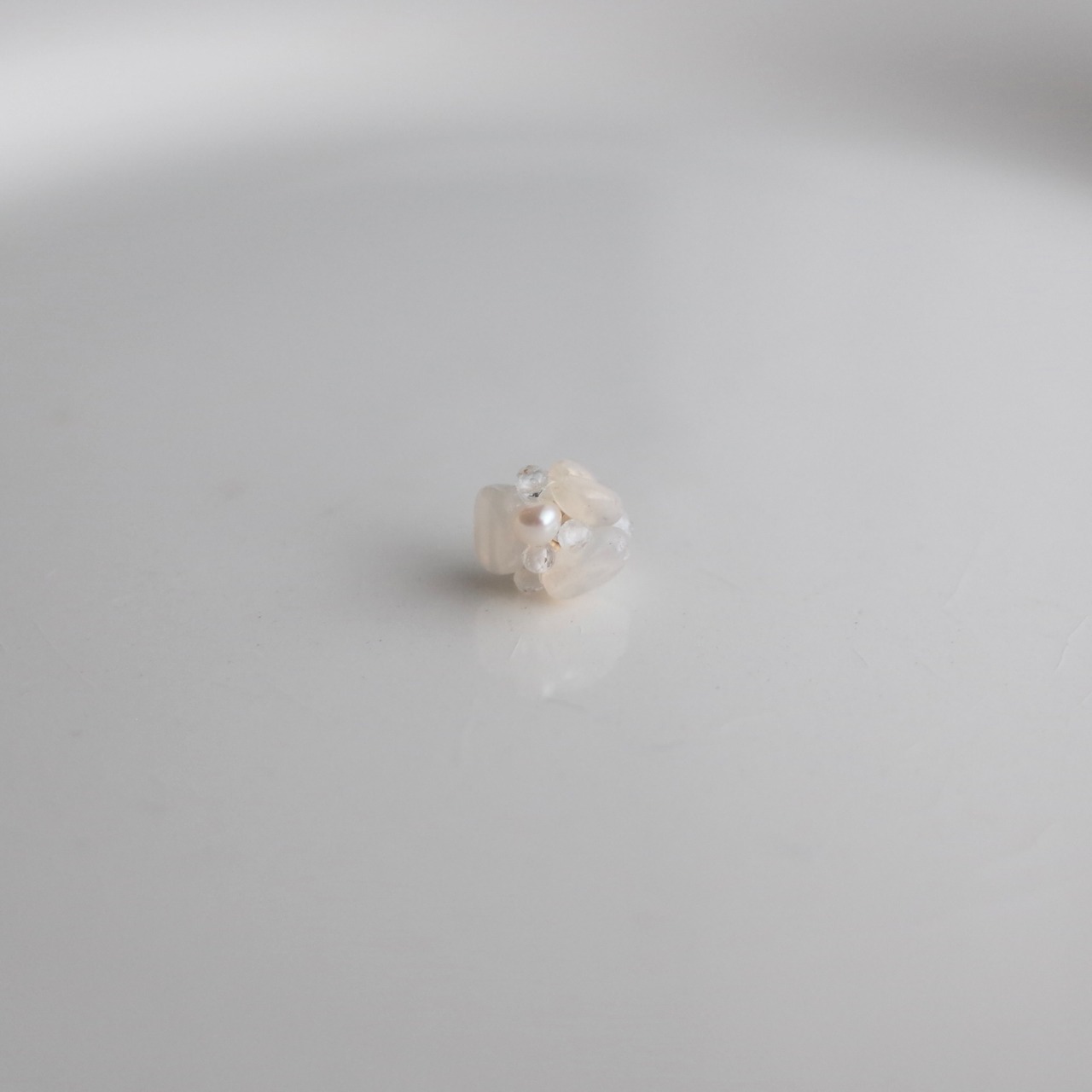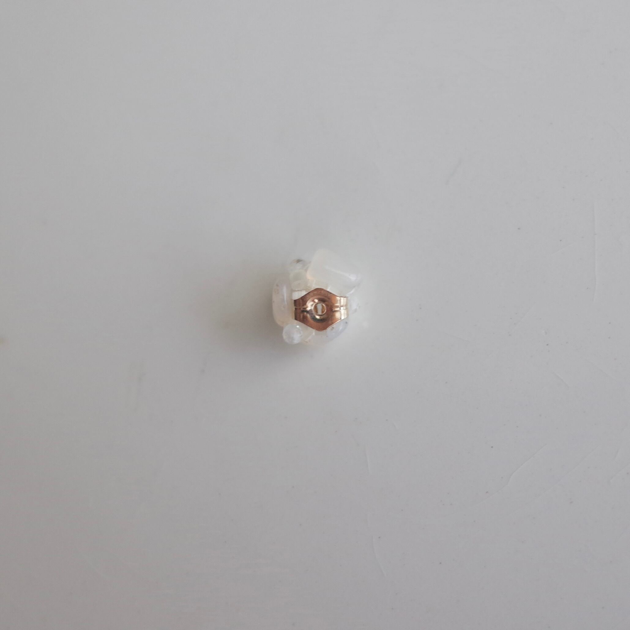 キャッチ部分は、エチオピア産オパール・パール・ホワイトトパーズ・線状に優しく光るガラスビーズを編みキャッチに仕上げております。